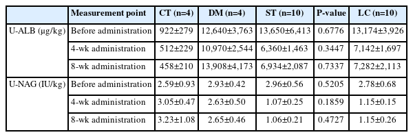 Urinary albumin and N‑acetylglucosaminidase levels showed no significant differences between the ST and LC groups at 8 weeks after administration (