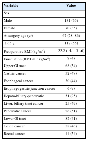 Among the 201 patients, 68 (34%) had upper gastrointestinal cancers, including gastric and esophageal cancers. Fifty-one patients (25%) had hepatobiliary and pancreatic cancers (such as liver, biliary tract, and pancreatic cancers), and 82 patients (41%) had lower gastrointestinal cancers, such as colon and rectal cancers. The baseline characteristics of the participants are presented in
