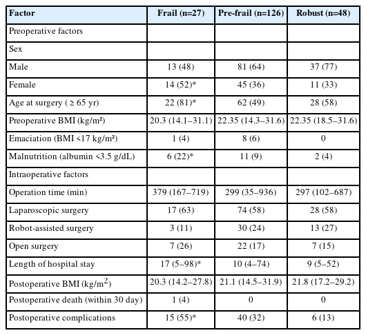 Among the 201 patients, 27 (13%) were classified as frail and 126 (63%) as pre-frail. Of the 27 frail patients, 22 (81%) were older adults—a significantly higher proportion compared to the pre-frail/robust group (P=0.004). The median hospital stay for frail patients was 17 days (range, 5–98 days), which was significantly longer than that for robust patients (P<0.001). Postoperative complications occurred in 15 frail patients (56%), which was higher than in pre-frail (n=40, 32%) and robust (n=6, 13%) patients. Furthermore, multivariate analysis showed that frailty was an independent risk factor for postoperative complications.