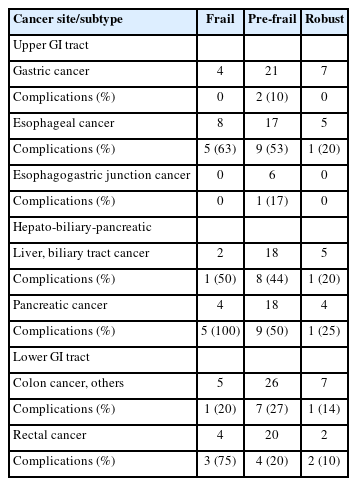 Table 2). The number of frail, pre-frail, and robust patients by cancer site is shown in