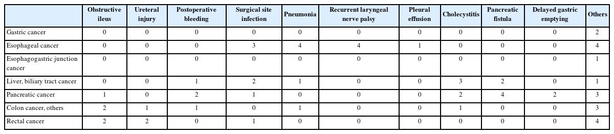 Table 3). Among these, the most common complications after esophagectomy were pneumonia, recurrent laryngeal nerve paralysis, and surgical site infection. Pancreatic fistula was most frequently observed after pancreatectomy (