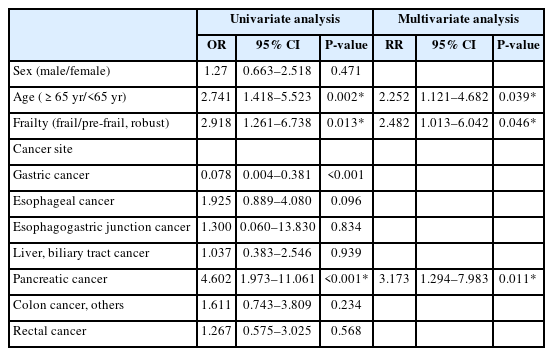 Univariate and multivariate analyses revealed that age ≥65 years (P=0.039), frailty (P=0.046), and pancreatic cancer (P=0.011) were significantly associated with an increased risk of postoperative complications (