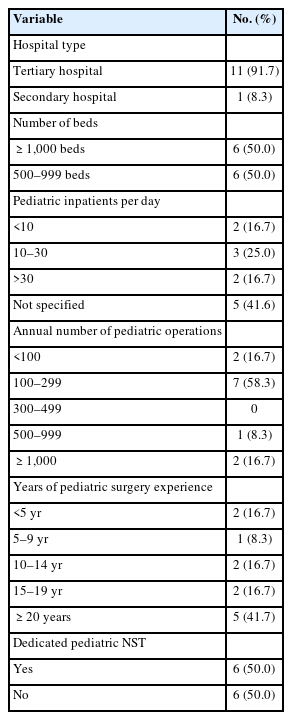 Demographic information for the pediatric surgeons who completed the survey on behalf of the 12 hospitals was not collected. The responses reflected institutional practices and the current status of pediatric nutritional support and NST implementation rather than personal opinions. The survey was distributed to 20 hospitals, and valid responses were received from 12 institutions, including both tertiary and secondary general hospitals across Korea. Most hospitals reported having more than 500 beds. Seven hospitals (58.3%) performed between 100 and 299 pediatric surgical procedures annually, while two institutions conducted over 1,000 cases per year. A dedicated pediatric NST was present in six of the 12 institutions (50.0%). Hospital characteristics are summarized in