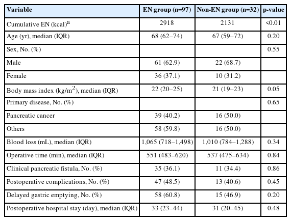 A total of 129 patients were included in the analysis, with a median age of 68 years (interquartile range, 61–74 years). The cohort comprised 83 men and 46 women. The underlying disease was pancreatic cancer in 55 cases. The EN group, defined as patients who received ≥600 mL/day of EN within 1 week postoperatively, included 97 cases, while the non-EN group comprised 32 cases. The cumulative energy intake via EN during the first postoperative week was significantly higher in the EN group (P<0.01). Clinical characteristics were compared between the two groups (