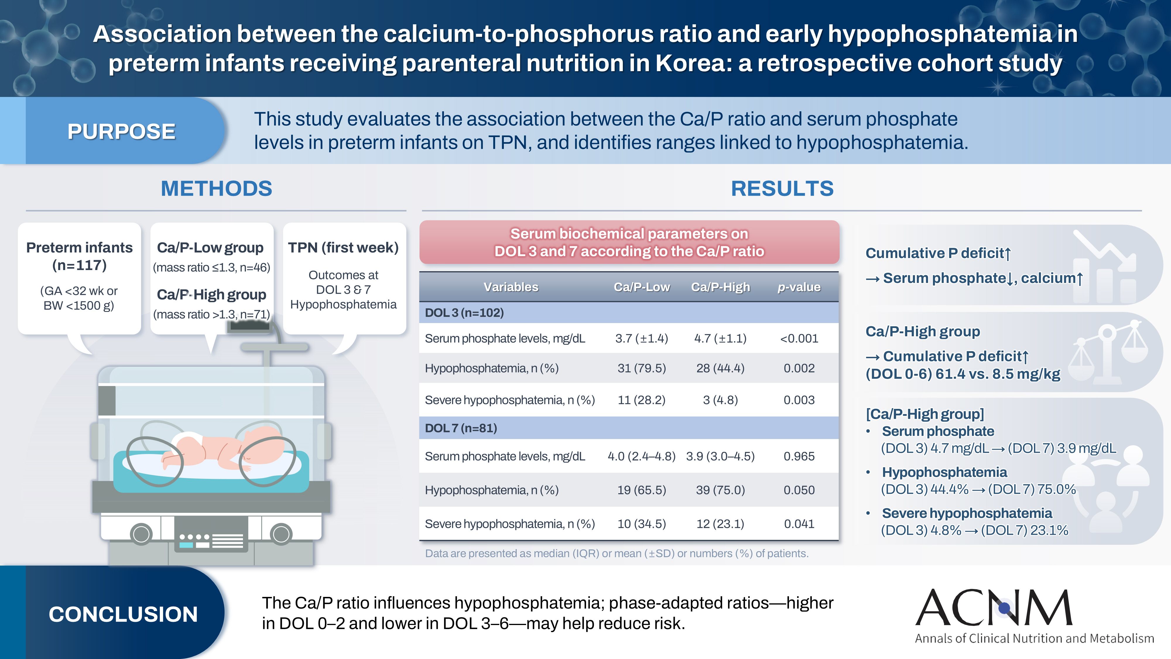 Association between the calcium-to-phosphorus ratio and early hypophosphatemia in preterm infants receiving parenteral nutrition in Korea: a retrospective cohort study Miseon Han