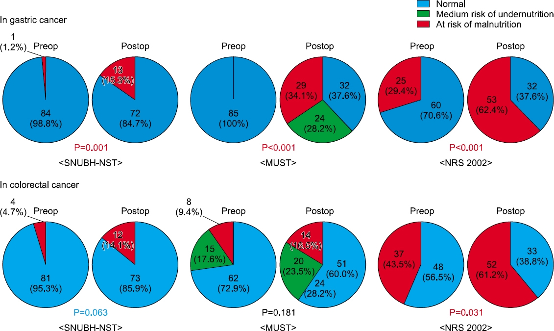 Fig. 1 Differences between preoperative and postoperative periods in the distribution of patients with risk of malnutrition according to the nutritional screening tools. In patients with gastric cancer, all three screening tools indicate significant impairment of the nutritional status after surgery. On the other hand, only NRS 2002 indicates significant impairment of nutritional status after colorectal cancer surgery. Although there were no significant differences, the number of patients at risk of malnutrition after surgery is higher according the SNUBH-NST and MUST. SNUBH-NST = the Seoul National University Bundang Hospital Nutritional Screening Tool; MUST = the Malnutrition Universal Screening Tool; NRS = the Nutritional Risk Screening.