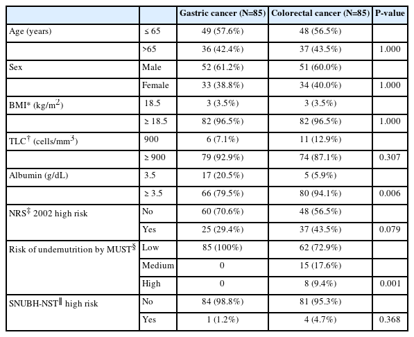 In the authors’ hospital, 407 patients (206 patients with GC and 201 patients with CRC) underwent surgery between July 2011 and June 2012. The patients from the two groups were matched using the propensity score and then analyzed the nutritional data from 170 patients (85 patients in each group), retrospectively.