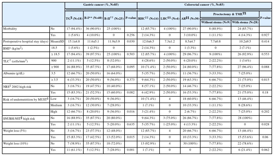 Table 5 Postoperative nutritional status at the time of discharge and morbidity according to type of surgery