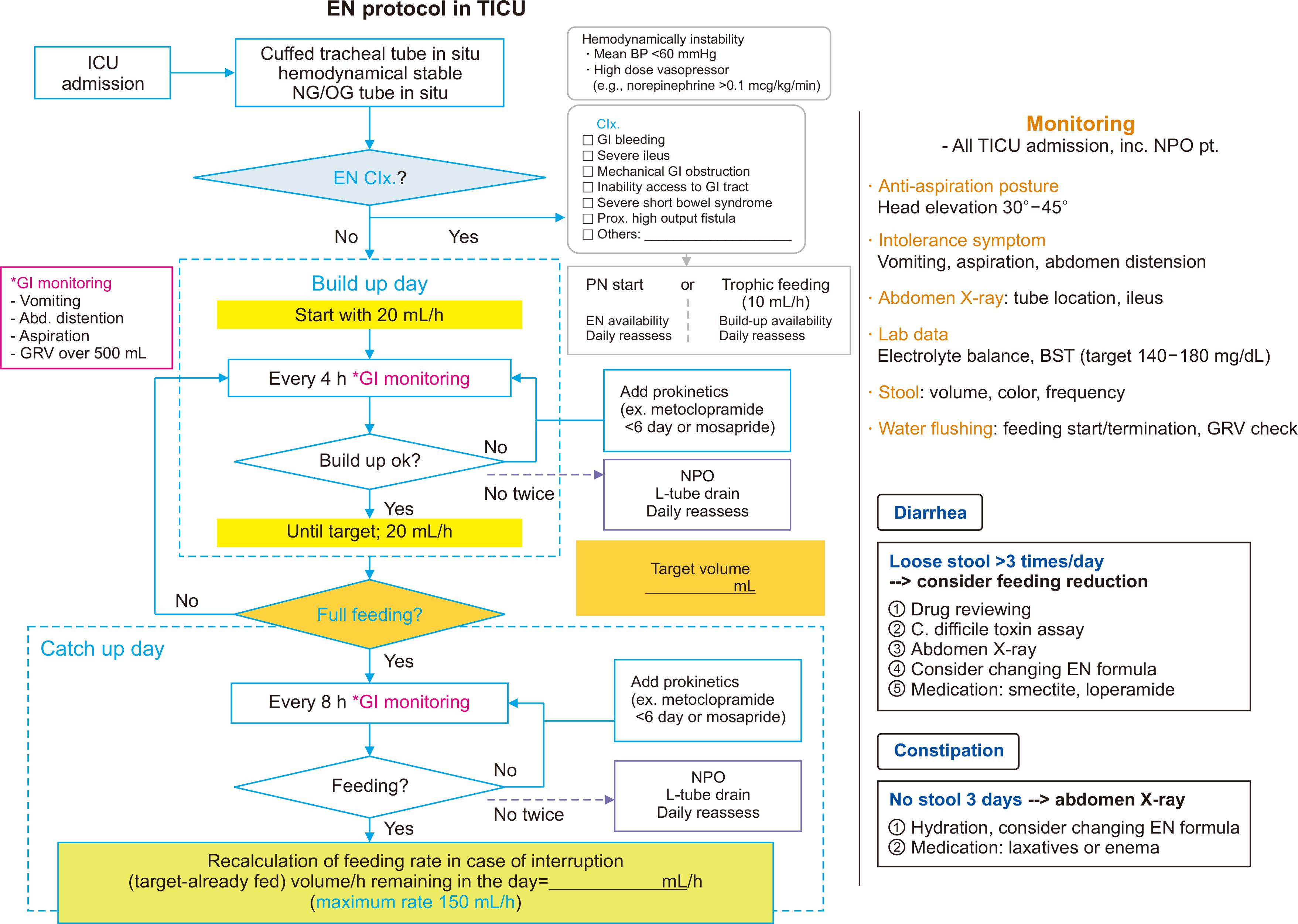 EN = enteral nutrition; TICU = trauma intensive care unit; ICU = intensive care unit; NG = nasogastric; OG = orogastric; CIx. = contraindication; GI = gastrointestinal; Abd. = abdominal; GRV = gastric residual volume; BP = blood pressure; Prox. = proximal; PN = parenteral nutrition; NPO = nil per os; BST = blood sugar test; C. difficile = clostridium difficile.
