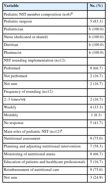 Table 2). NST rounds were conducted in 58.3% of institutions, most commonly on a weekly basis. The major responsibilities of pediatric NSTs included nutritional assessment and discussion of interventions for malnourished patients. In five of the 12 centers, NSTs were also involved in providing education for patients and healthcare professionals (