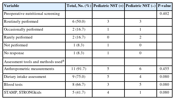 Table 4). Common assessment methods included anthropometric measurements (91.7%), dietary intake evaluations (75.0%), and blood tests (66.7%). Validated screening tools such as the Screening Tool for the Assessment of Malnutrition in Pediatrics (STAMP) and the Screening Tool for Risk of Nutritional Status and Growth in Children (STRONGkids) were each used in 41.7% of hospitals. When stratified by NST presence, hospitals with a pediatric NST were more likely to use STAMP and STRONGkids, although the differences were not statistically significant (P=0.080). No significant difference was observed in the overall frequency of nutritional screening (P=0.402).