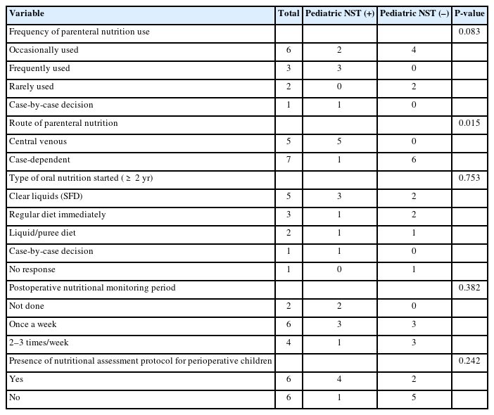Table 5). Central venous access was significantly more common in hospitals with a pediatric NST compared to those without (83.3% vs. 0.0%, P=0.015). The initiation of oral nutrition in children aged ≥2 years varied, with clear liquid diets being the most common approach (41.7%). Calculation of nutritional requirements was primarily based on kcal/kg/day (58.3%). Weight trends and physical examination findings were the most frequently used indicators of postoperative nutritional status. The presence of a pediatric NST was not associated with significant differences in the timing of oral nutrition initiation (P=0.753) or in the use of nutritional indicators (P=0.261).