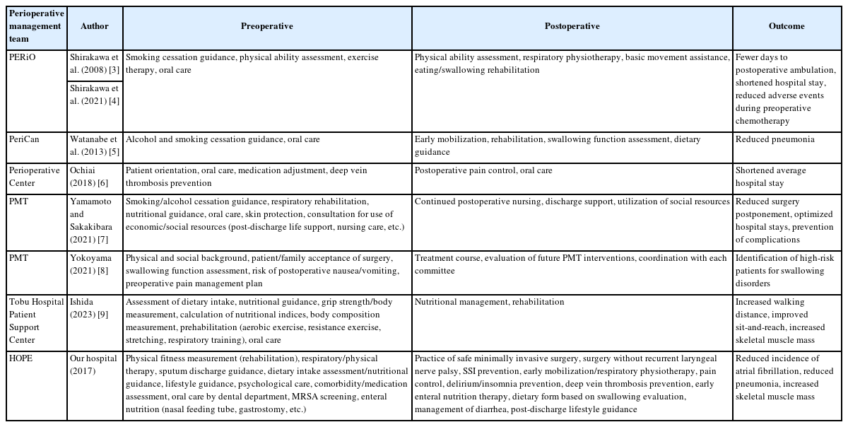 5] established a Perioperative Team at the Cancer Institute Hospital (PeriCan) in 2013. This team provides preoperative guidance on abstinence from alcohol and smoking, oral care, early postoperative mobilization, rehabilitation, assessment of swallowing function, and dietary guidance (