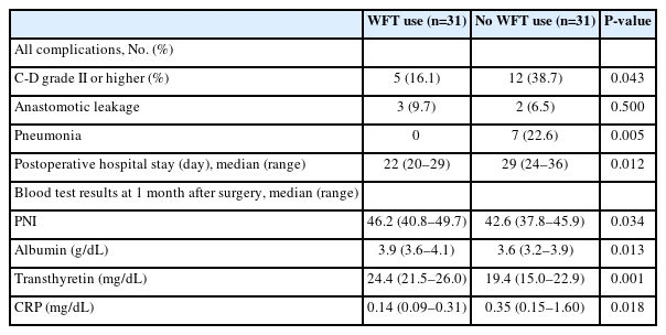 Regarding nutritional indicators at 1 month after surgery, serum albumin levels (median, WFT group 3.9 g/dL vs. non-WFT group 3.6 g/dL; P=0.013), serum transthyretin levels (median, WFT group 24.4 mg/dL vs. non-WFT group 19.4 mg/dL; P=0.001), and the prognostic nutritional index (PNI) (median, WFT group 46.2 vs. non-WFT group 42.6; P=0.034) were all significantly higher in the WFT group (